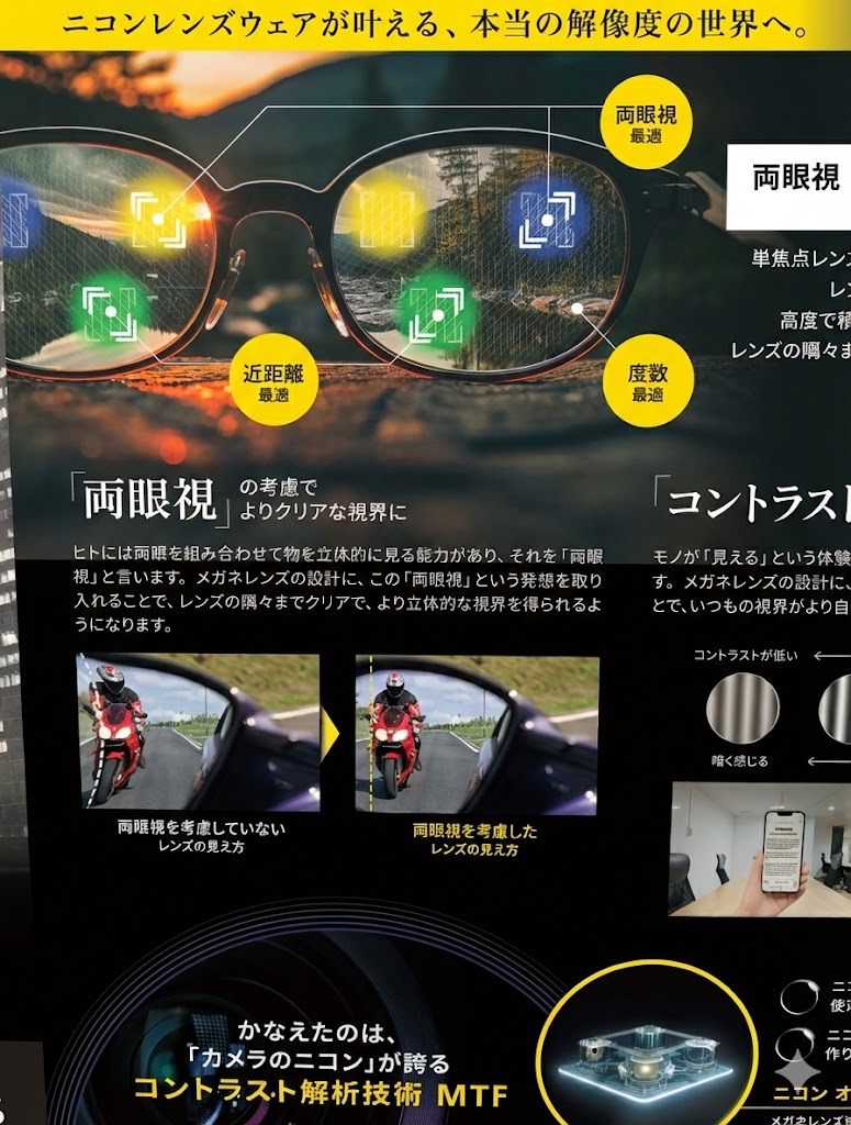 両眼で見たものを、視神経を通じて脳内で融像する際に、レンズ自体で補正を掛け、クリアにしてくれる。